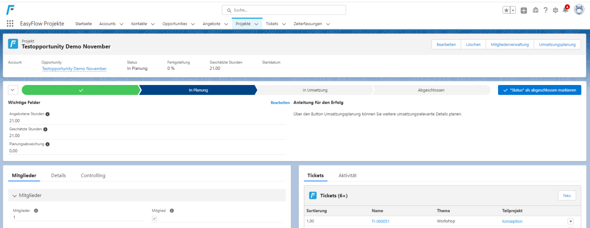 Der Status des Projektes stellt sich nun automatisch auf „In Planung“ um.