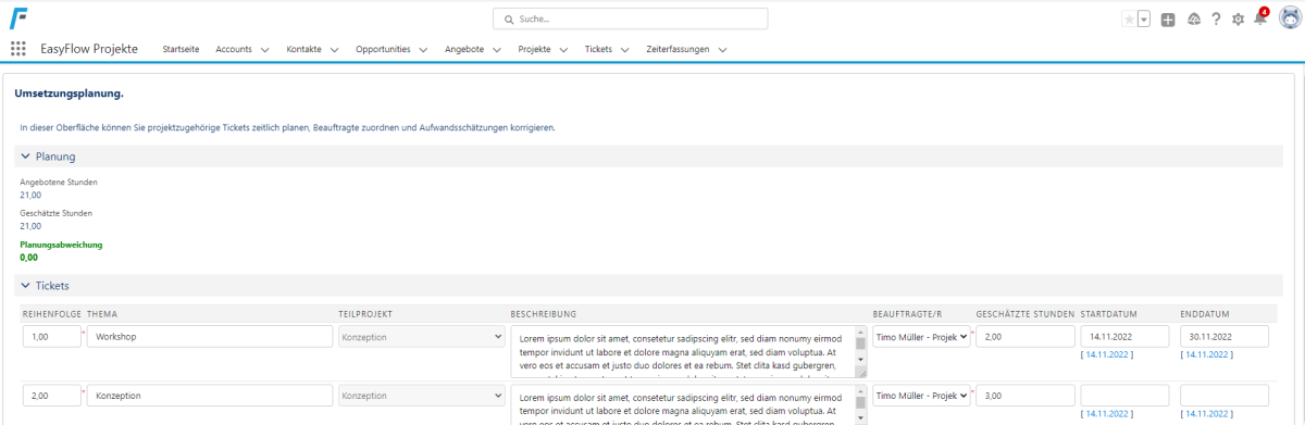 In der Themenliste „Planungen“ siehst du auf deinem Angebot bereits eine Auflistung an Arbeitsaufträgen, den Tickets. Die Tickets werden automatisch aus den Ticketvorlagen erstellt, die dem jeweiligen Produkt zugeordnet sind.