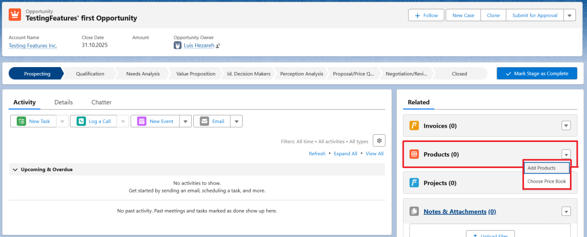 Alternativ kannst du auch gleich ein Angebot erstellen (siehe „Erstellung eines Angebots“ im nächsten Schritt) und in der Themenliste Angebotsbelegposten über „Produkte hinzufügen“ dein Angebot erstellen. Sobald du das Angebot synchronisierst, werden dann auch entsprechend die Opportunity Produkte angelegt.