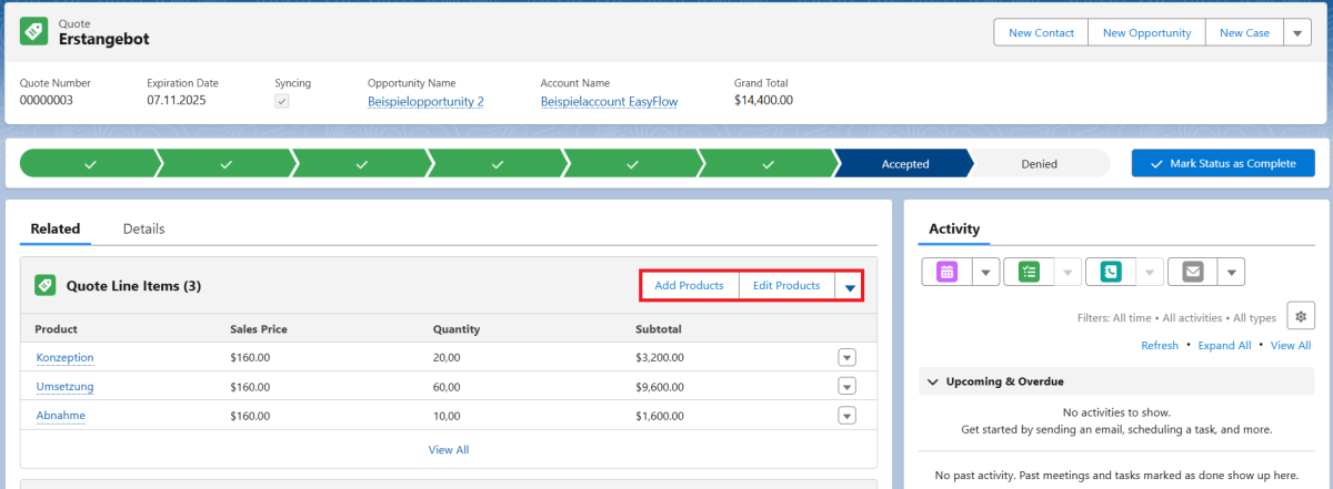 Hinweis: Du kannst mehrere Angebote erstellen, denke aber daran, das finale Angebot mit der Opportunity zu synchronisieren. Dies kannst du beispielsweise über die Schaltfläche „Synchronisierung starten“ auf Angebotsebene vornehmen.