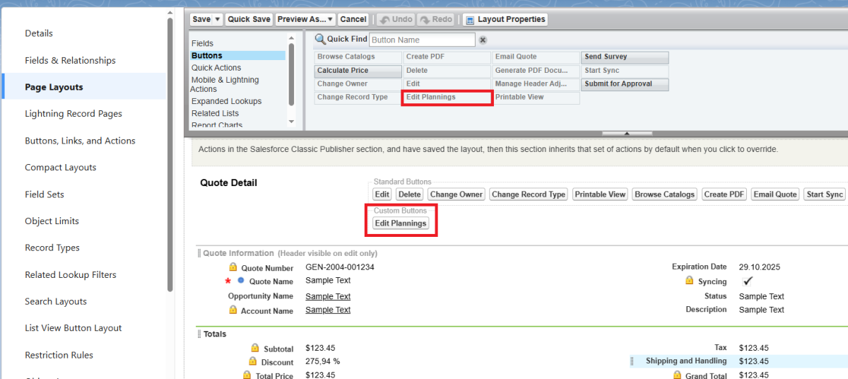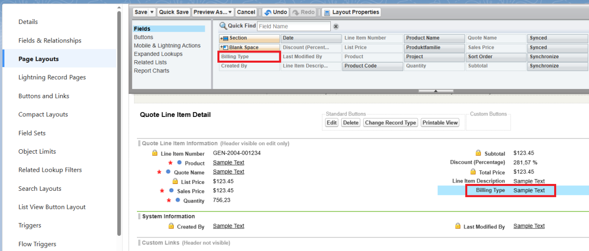 Ebenfalls kannst du in den „Angebotsbelegposten“ das Feld „Abrechnungsart“ im Seitenlayout hinzufügen. Gehe hierzu auf „Setup“ > “Objekt-Manager“ > Suche nach „Angebotsbelegposten“ > gehe auf „Bearbeiten“ > „Seitenlayout“.