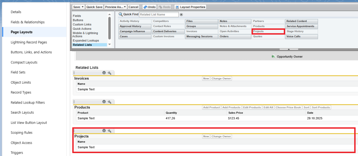Um relevante Informationen zu dem Projekt auch auf der Opportunity im Blick zu haben, solltest du auf dem Opportunity Tab über „Setup“ > „Objekt bearbeiten“ > „Seitenlayout“ dem Opportunity Seitenlayout die Themenliste "Projekte" hinzufügen.