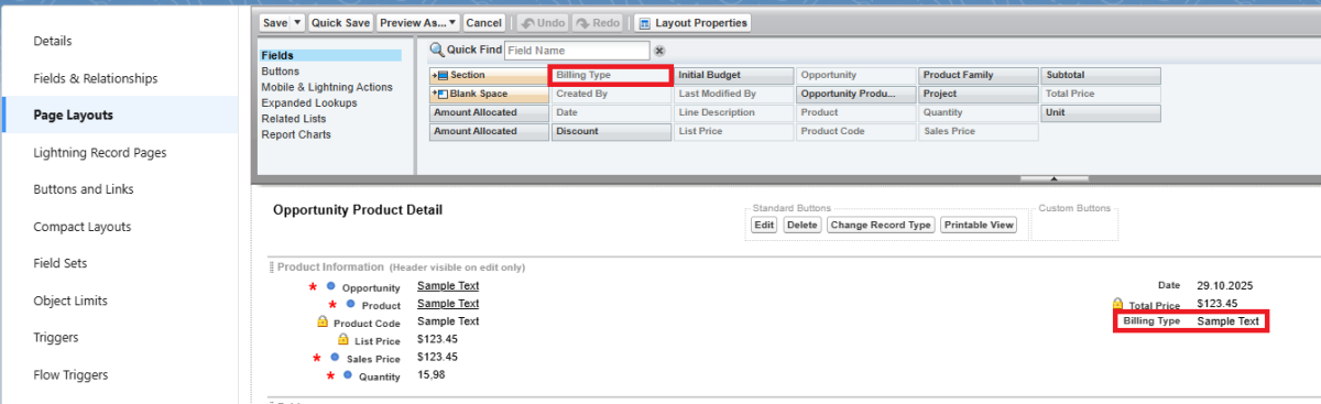 Um relevante Informationen zu deinen angebotenen Projektbestandteilen und Feldern auf dem jeweiligen Opportunity Produkt im Blick zu haben, solltest du das durch die Installation von EasyFlow Projekte bereitgestellte Feld „Abrechnungsart“ dem Layout hinzufügen. Gehe hierzu auf „Setup“ > „Objekt-Manager“ > suche nach „Opportunity Produkt“ > gehe auf „Bearbeiten“ > „Seitenlayout“ und füge das Feld hinzu. Anschließend kannst du dem Opportunity Seitenlayout die Themenliste „Teilprojekte“ hinzufügen.