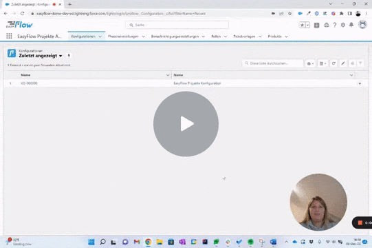Suche zunächst im App Launcher oder über die Suchfunktion die „EasyFlow Projekte Admin“-Applikation. Wechsle in den für diesen Schritt benötigten „Konfigurationen“-Reiter. Hier kannst du einmalig im Datensatz Angaben zu den grundlegenden Konfigurationsparametern anlegen.