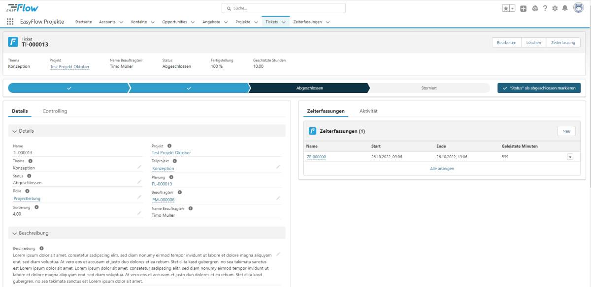 | Beschreibung | Hier siehst du die Beschreibung des Tickets. Du kannst diese hier außerdem beliebig verändern. |