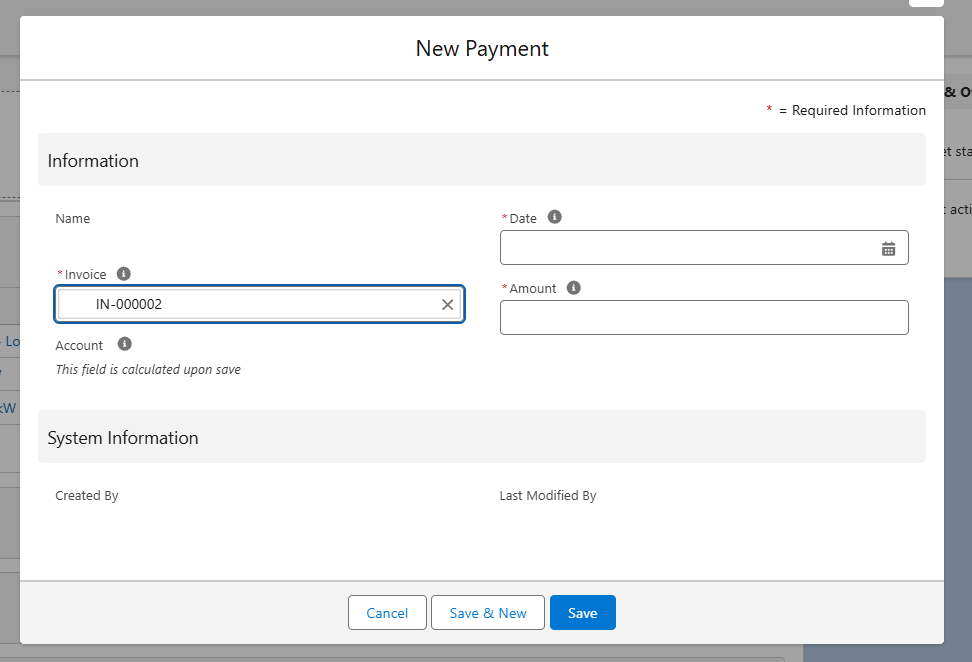 | Account | Formula Field | Refers to the corresponding customer account that made the payment. |