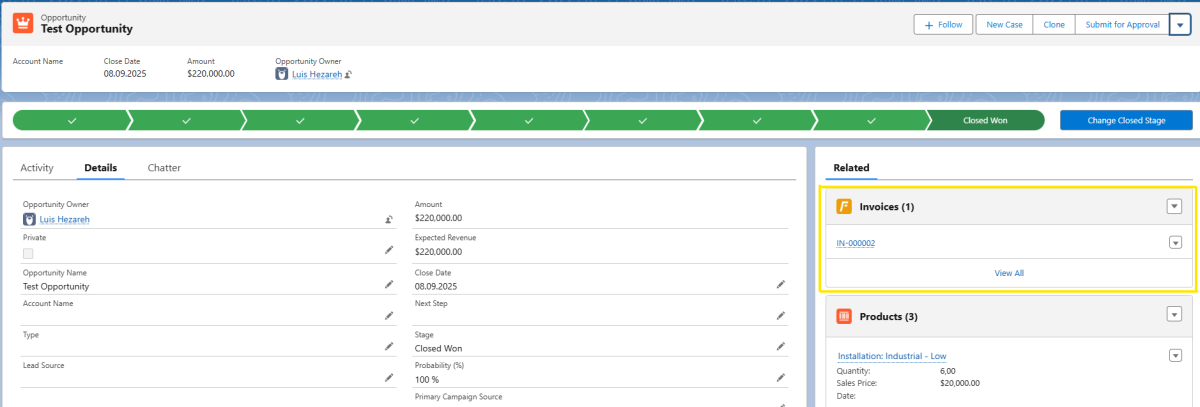 The invoice will now be created automatically and appear in your opportunity's related lists.