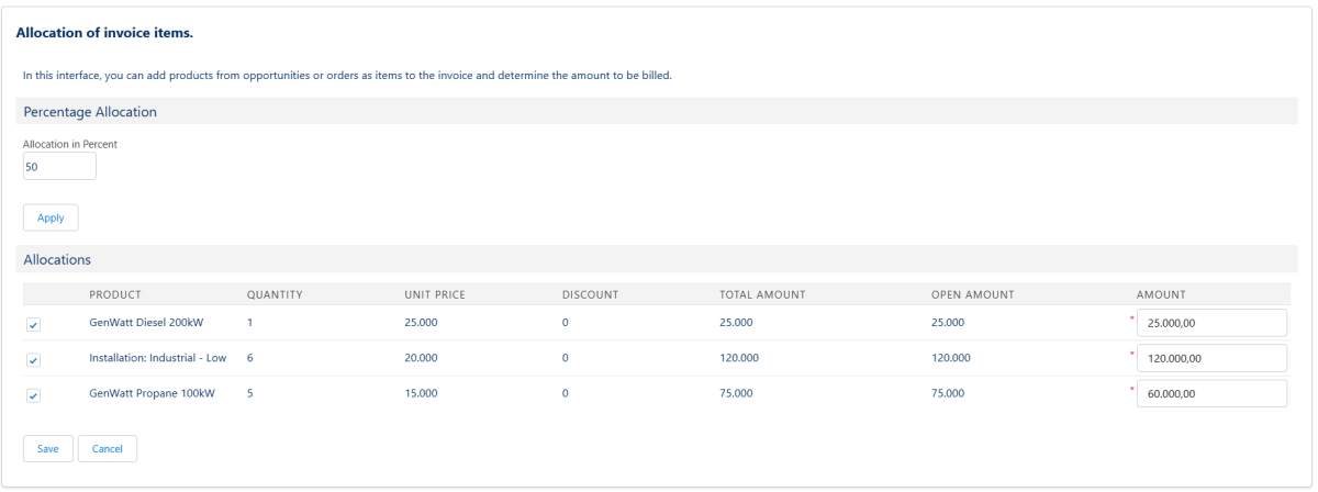 >Using the "Allocation" button on the top right of the invoice record, you will get to an interface where you can add opportunity products as items to the invoice. You can do this either directly in the Amount field or by using the "Allocation in Percent" field. The value you enter here will be applied to all items when you click on "Apply". This allows for flexible partial billing. We recommend to always enter 100% for the last partial invoice to avoid rounding problems.